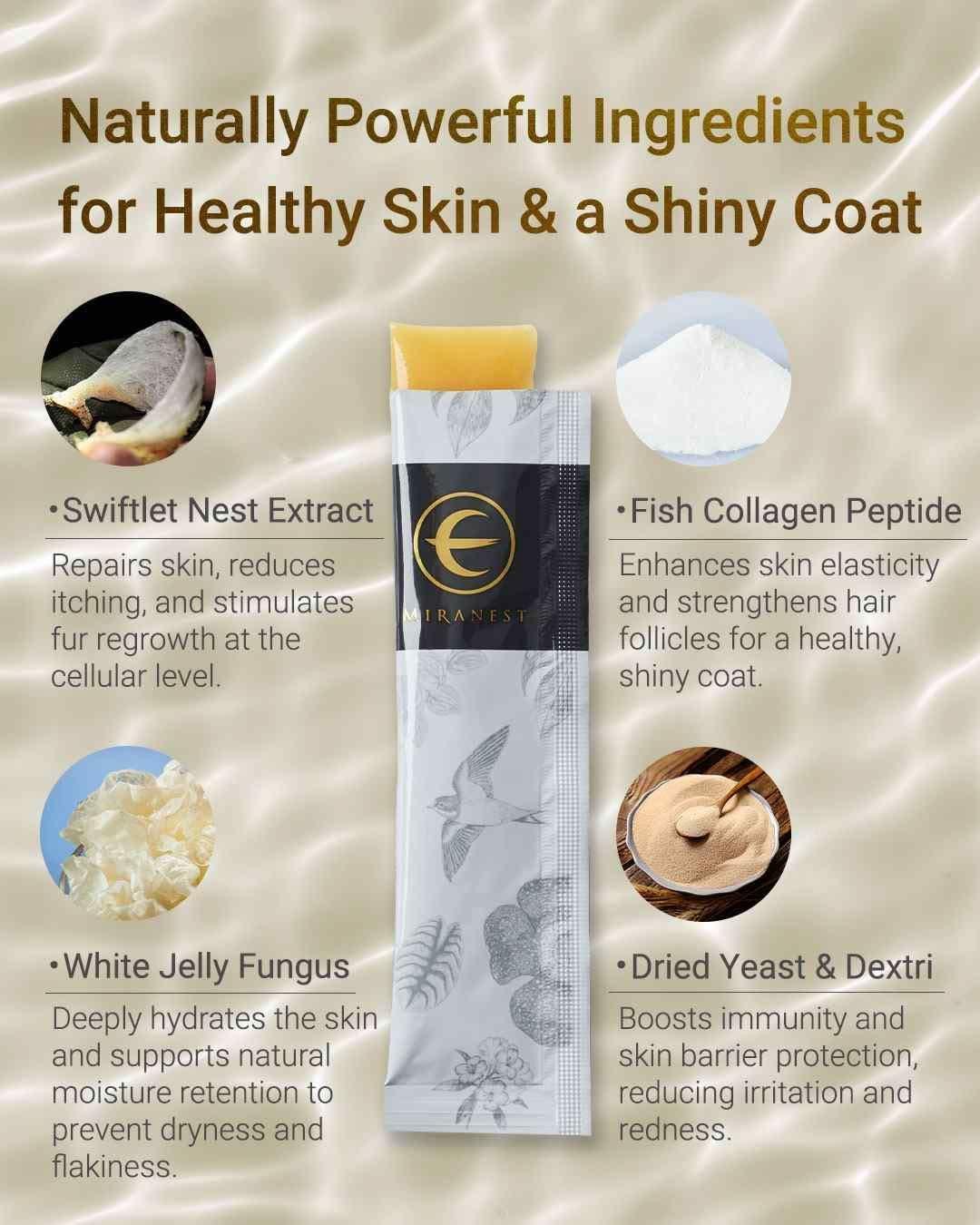 Support your dog's health naturally with MIRANEST Jelly Sticks. These delicious, easy-to-feed sticks are made with all-natural ingredients, including Swiftlet Nest extract, to boost your dog's immune system, promote a shiny coat, and improve digestion. With no harmful chemicals, MIRANEST Jelly Sticks offer a safe and effective way to help your dog live a healthier, longer life. Perfect for daily use, these jelly sticks are loved by dogs and trusted by pet owners worldwide.